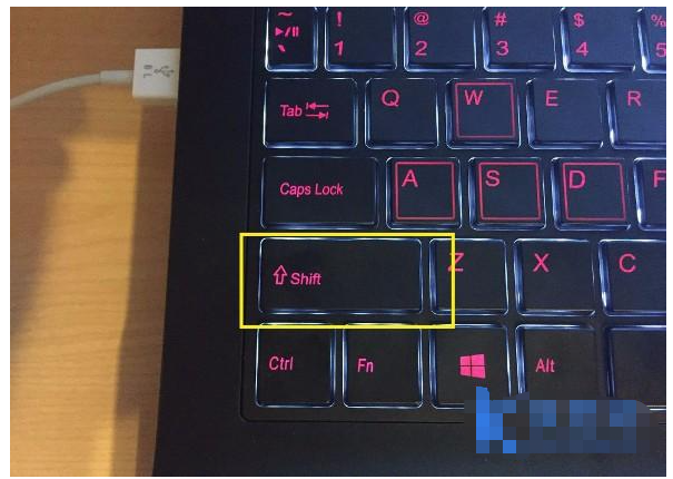 2、按住键盘上Shift键(Shift键,就是键盘左下放下,Ctrl键上面那个长一点的,带有一个向上箭头的按键)不放手,然后点击系统开始菜单中的“重启按钮”,让机器重新启动。