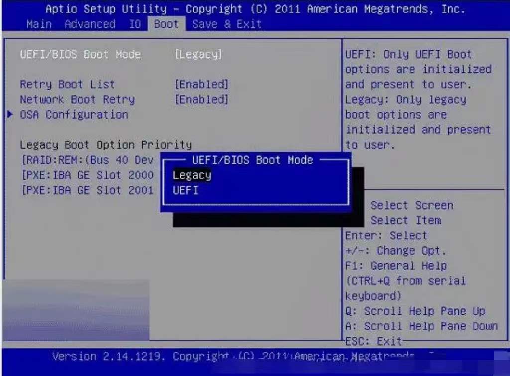 1.使用已经制作好的系统磁碟或者usb(U盘)启动,然后在BIOS中将启动模式调整为UEFI(适用于使用旧版BIOS的用户),如下图所示:(进入BIOS的快捷键不同电脑有不一样的操作,通常为F11或者F12)