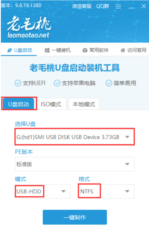 在页面中选择“U盘启动”,在磁盘列表中选择需要制作启动的设备,在模式选项中选择“USB-HDD”, 选择格式”NTFS“并点击“一键制作”。