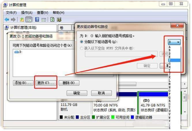 2、等到出现弹窗后,点击【更改】,选择【分配一下驱动器号】,接着再点击右边的下拉框选择一个先盘符,选好后点击确定,稍等片刻后系统就会重新读取U盘。