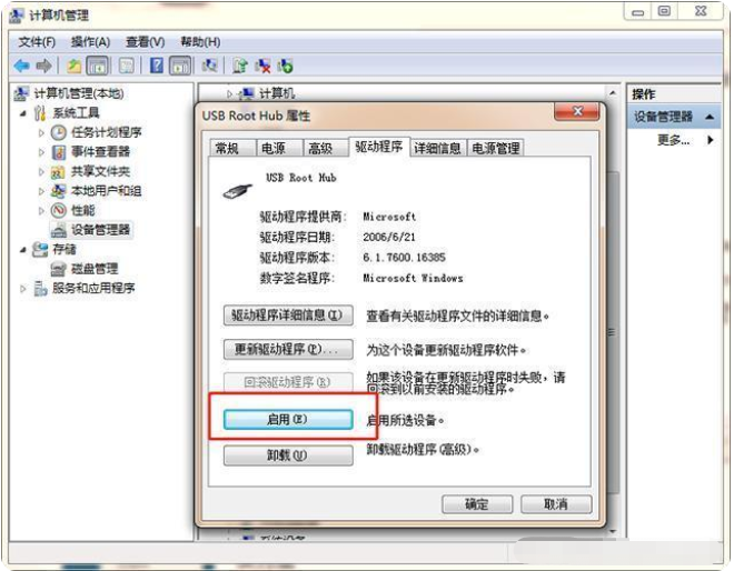 1、如果上述方法不行,那么可以重启USB设备。方法一中打开【USB大容量存储设备】,选择【驱动程序】,这里驱动可能被禁用了,我们选择【启用】再将U盘插上去看看是否被读取了。