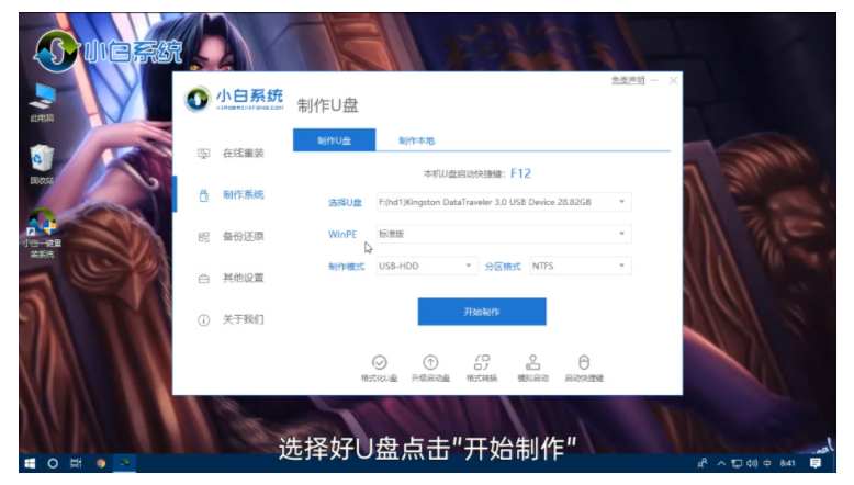 2、插入U盘然后打开小白系统软件,切换到【制作系统】界面,选择【开始制作】。