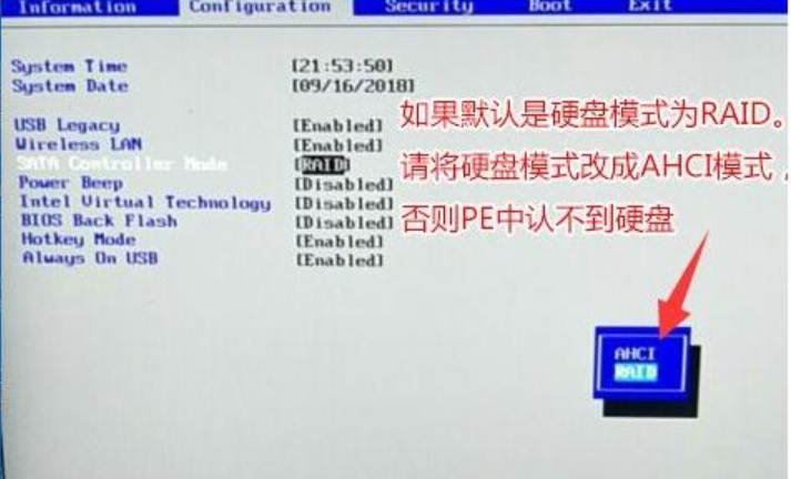 5.以后再返回【configuration】作用,大家查看【satacontroller作用上,假如默认的电脑硬盘模式是RAID,就必须把电脑硬盘模式改为AHCI模式,不让大家进PE后无法识别电脑硬盘,就按F10来保存。
