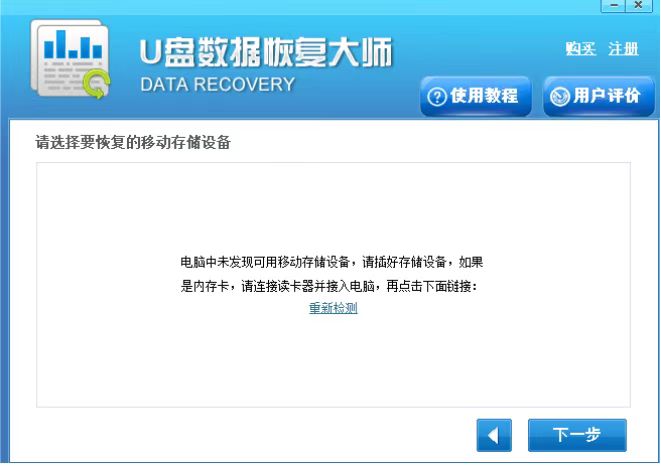 3、接下来U盘数据恢复大师软件会检测电脑上连接的U盘或者是手机设备,如果出现下图中的界面,就表明没有检测到U盘或者内存卡,我们需要检查是否正确连接电脑,或者重新插入后我们点击重新检测。
