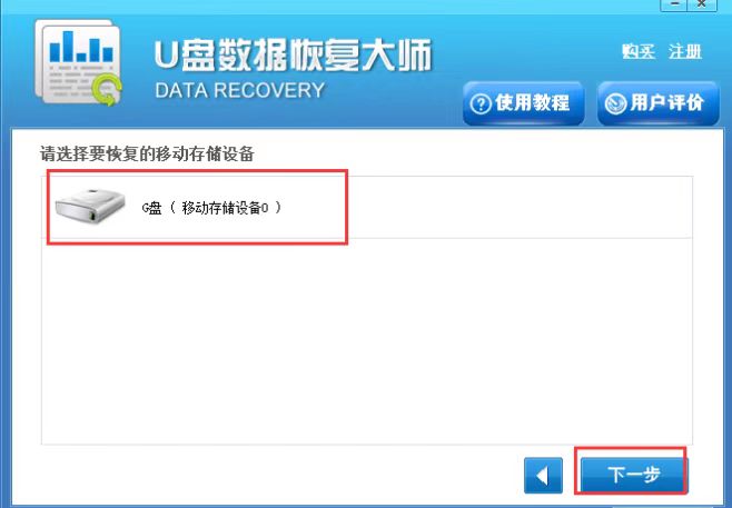 4、重新插入U盘或者内存卡后,点击重新检测等待检测完成后我们就可以看到下图中的界面,软件已经成功检测到存储设备,接下来我们点击选中存储设备后,再点击下一步。