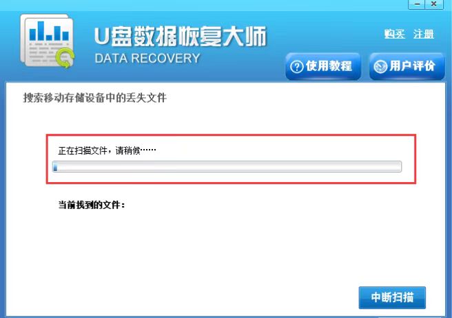 5、接下来U盘数据恢复大师软件会扫描U盘中丢失的文件,如下图所示,在界面中会显示当前找到的文件,这个扫描过程是需要一点时间的,我们需要耐心等待。
