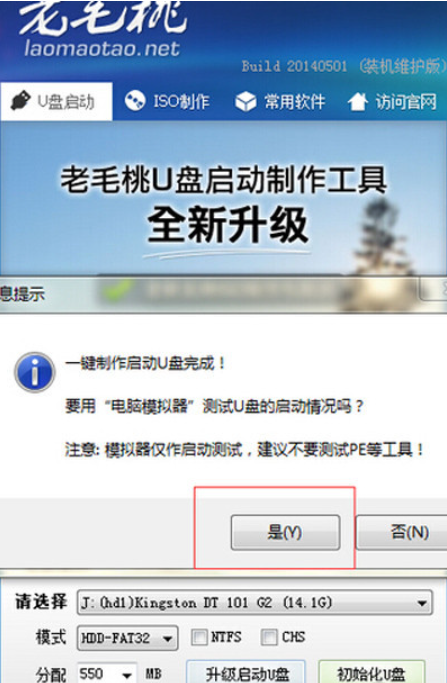 打开老毛桃;插入U盘,点击一键制作成usb启动盘,软件就开始制作了。制作完毕后,就开始测试U盘菜单测试,弹出U盘启动菜单,表示U盘启动盘制作成功。