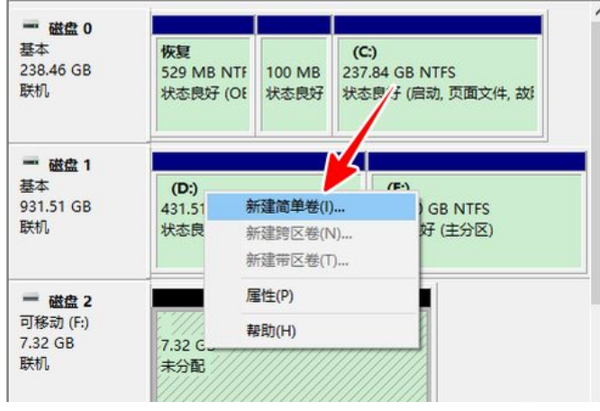 5、在 U 盘上再次右击,选择“新建简单卷”。