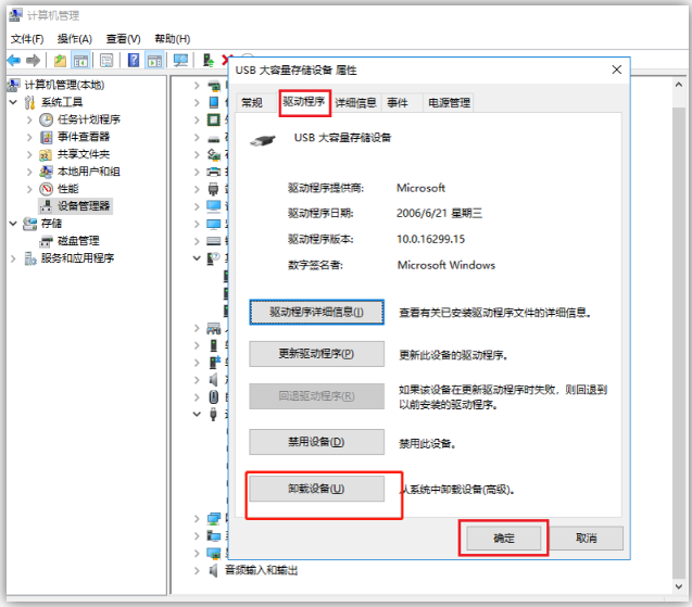 2、依次点击「驱动程序」-「卸载设备」-「确定」,卸载完成之后,再将U盘重新插入电脑,系统会自动加载U盘驱动,最后检查一下U盘是否被读取。