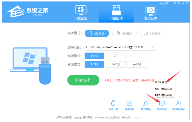 7、启动U盘制作完毕后,需要测试当前U盘启动盘是否制作完成,点击页面右下方的模拟启动,然后点击BIOS启动。