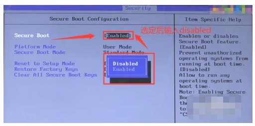 3、跳转至SecureBoot界面后,选定后置代码,输入“Disabled”的代码,然后返回“Security”界面。