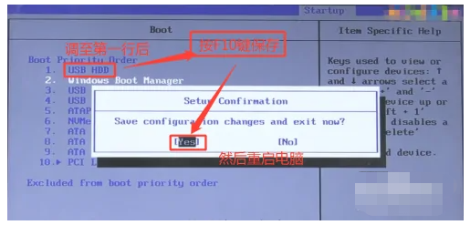 6、然后按F10键保存设置,最后选择“Yes”重新启动电脑即可。