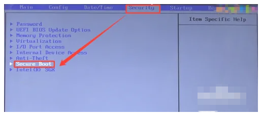 2、跳转至BIOS界面后,使用方向键切换到“Security”界面,在该界面中选择SecureBoot项,回车进入该页面中。