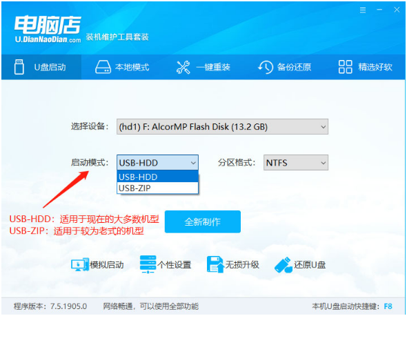2、这时需要选择“u盘启动”,点击需要制作启动的设备,在模式选项中选择“USB-HDD”,格式选择“NTFS”即可。