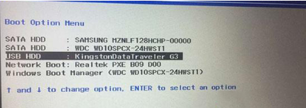 6、最后我们插入启动盘到电脑上,重启电脑时按F12或FN+F12调出启动管理窗口,选择USB HDD按回车进入PE就可以使用u盘重装系统。