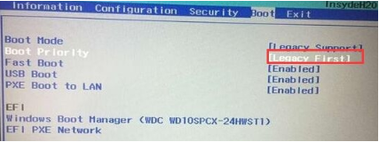 3、将【Boot】选项下的【Boot Mode】改成【Legacy Support】,【Boot Priority】设置成【Legacy First】;