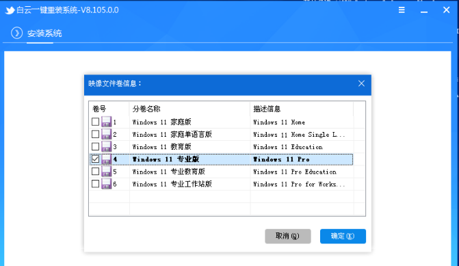 17、映像文件卷信息,选择要安装的系统版本,再点击确定;