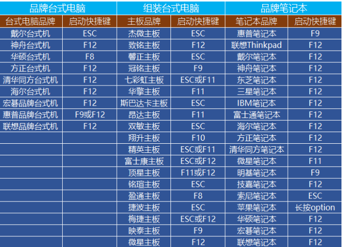 9、以上启动U盘就制作好了,下面我们需要根据自己电脑品牌或者主板品牌在下图找到自己电脑的启动热键;