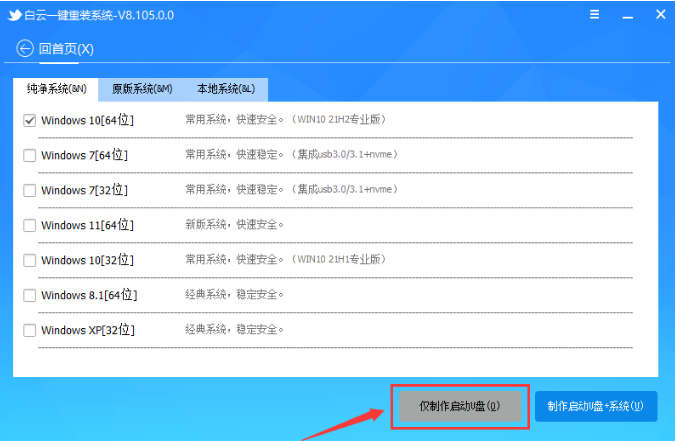 6、如果已经准备好系统,可以直接点击【仅制作启动U盘】,如果没有系统,可以勾选需要安装的系统(支持选择纯净系统或原版系统),再点击【制作启动U盘+系统】;