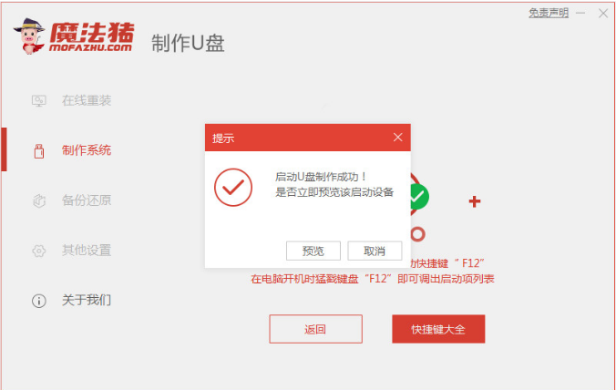 4、软件将会开始制作u盘启动盘,等待提示成功之后我们可以点击预览进入。