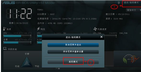 2、进入到bios页面面,点击右上角“退出/高级模式”,在弹出页面,用上下方向键选择“高级模式”项,按回车键执行即可。
