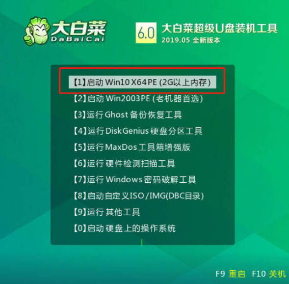2、在菜单界面移动光标选择【1】Win10X64PE(2G以上内存),按回车键确认进入winpe桌面。
