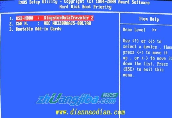 如图3:硬盘启动优先级(Hard Disk Boot Priority)选择:使用小键盘上的加减号“+、-”来选择与移动设备,将U盘选择在最上面。然后,按ESC键退出,回到图2的设置界面。