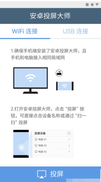 第二步:手机连接电脑,有WiFi连接和USB连接两种方式,今天我只介绍WiFi连接方法:先确保电脑和手机在同一个WiFi环境下,双击电脑端软件,再在手机上打开APP,点击“投屏”后,会自动弹出电脑设备端名称,选择连接即可。