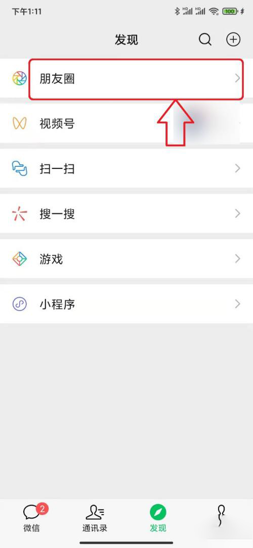 2、在弹出的发现设置页面中,选择"朋友圈"选项。