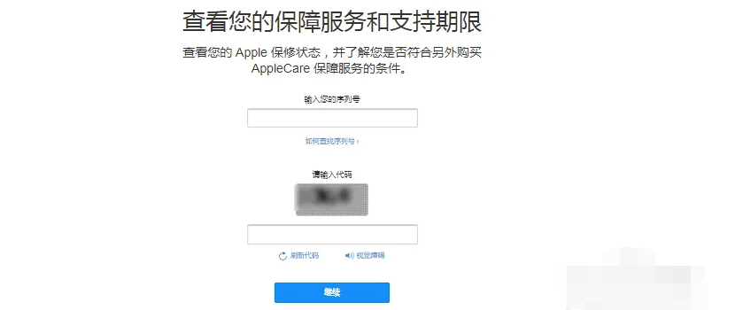 3、进入到【查看您的保障服务和支持期限】页面,输入苹果手机的序列号和验证码,点击【继续】。