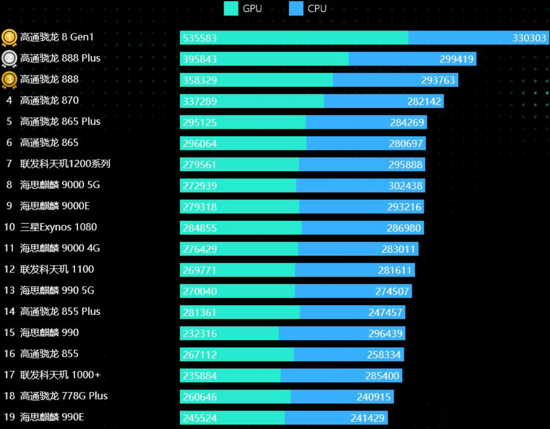 下面这个最新手机芯片soc跑分排行榜,Android手机芯片跑分由两部分组成即cpu跑分和gpu跑分。