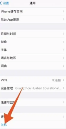 2、滑动屏幕到最底部,点击关机这个功能,弹出关机界面。