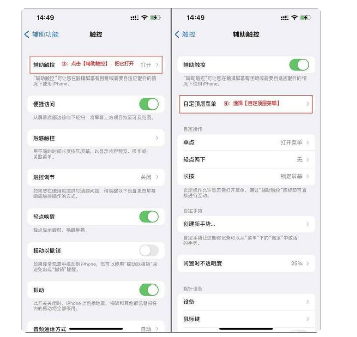 2、把“辅助触控”打开,点击“自定顶层菜单”;