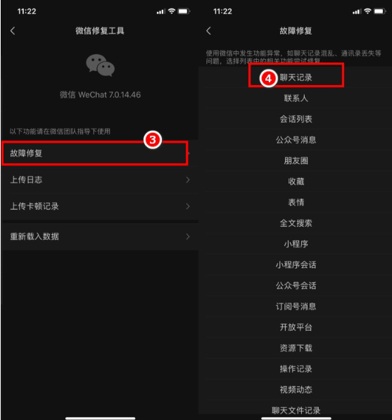 3、进入页面后会有一个故障修复,点击进去就可以看到有聊天记录的选项了,点击确定进行恢复即可。