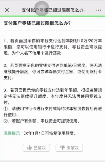 3、选择支付账户零钱已超过限额怎么办,查看官方回复微信零钱限额可以使用银行卡支付,或者等次年一月一日解除限额。