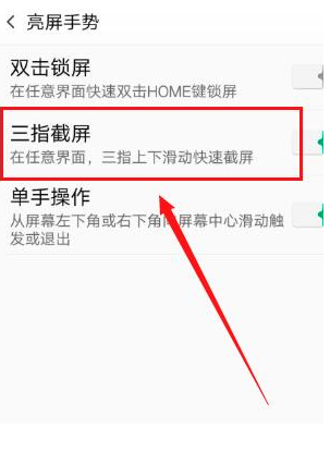 3、点击打开三指截屏功能,使用三根手指从上到下划过屏幕就可以截屏啦。