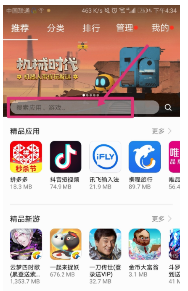 2.进入应用市场后,点击搜素栏输入陌陌。