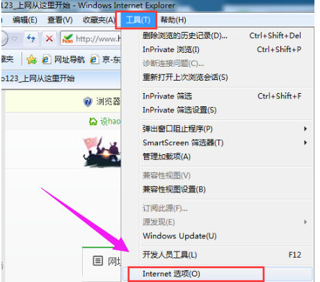 1.首先打开ie浏览器,在ie浏览器界面的上方中点击“工具”选项,在弹出的下拉框中选择“Internet选项”打开。