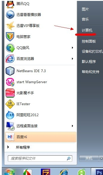 1.进入win7桌面,鼠标点击桌面左下角的开始按钮,在弹出的菜单中选择“计算机”,进入下一步。