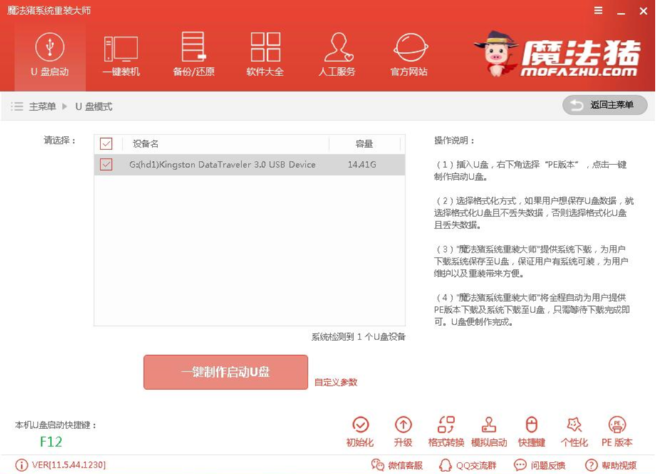 1,首先用U盘启动盘制作工具的U盘模式制作好启动盘,U盘启动盘的制作比较简单,插入U盘按照提示点击一键制作U盘启动盘即可。