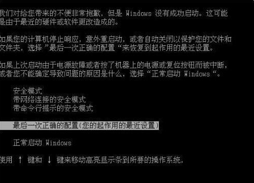 按F8进入笔记本的高级模式,我们便能进入到高级模式后,我们选择最近一次正确的配置,然后点击确定,如果问题不大的话能够解决问题的。