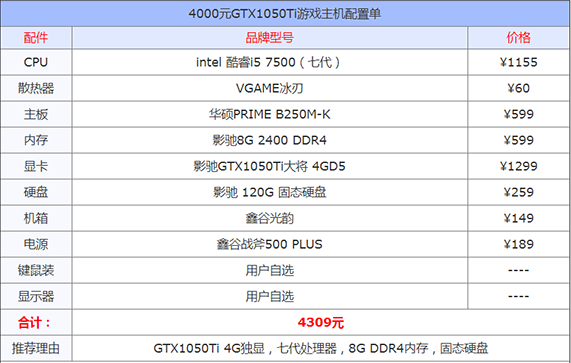 图中可以看到,i5 7500处理器的的功耗是65W,影驰GTX1050Ti的功耗是75W(个别品牌型号的显卡参数里边可能没有标出功耗,你可以找同型号的其它品牌,比如华硕GTX1050Ti的参数里没有写功耗值,那你找影驰GTX1050Ti的就可以)