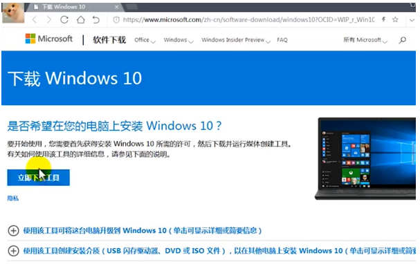 1.先打开浏览器到微软官网找到win10下载工具,然后立即点击下载工具。