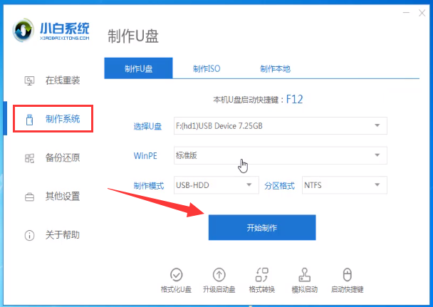1.把空的U盘插进电脑,打开小白一键重装系统软件,关闭杀毒工具(包括360安全卫士),等小白探测环境完成,点击制作系统,【开始制作】。