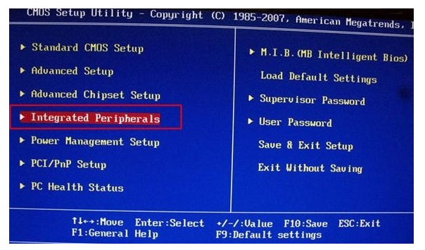 1、启动电脑时不停按Delete或F2或F1等按键进入BIOS,按↓方向键选择Integrated Peripherals,按回车键;