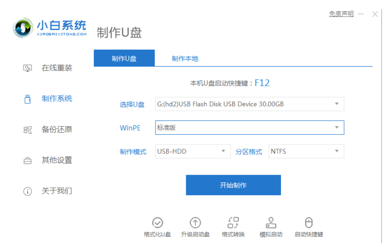 1、首先下载安装小白一键重装系统软件打开,将u盘插入电脑。关闭电脑的杀毒软件,点击软件界面左侧的“制作系统”,点击“开始制作”下一步。