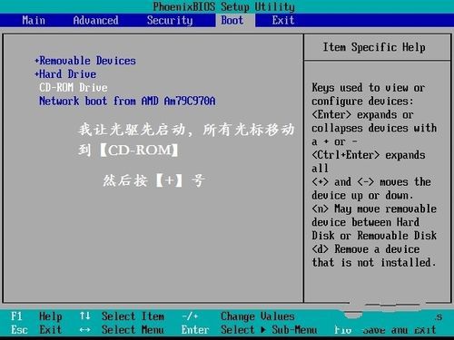 在【BOOT】下 把光标移动到你想要优先启动的设备上面,然后按【+】号置顶。