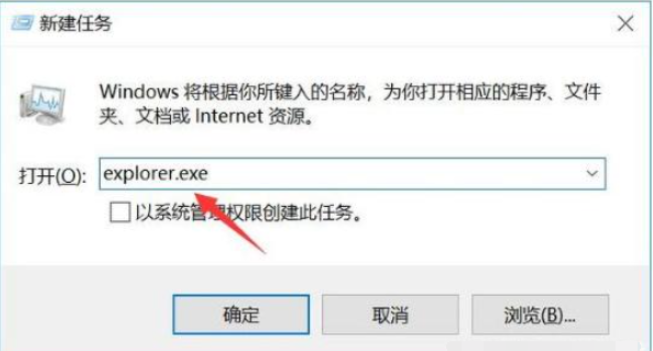 3、出现运行窗口,输入“explorer.exe”按回车确定打开。接着电脑就恢复正常了。