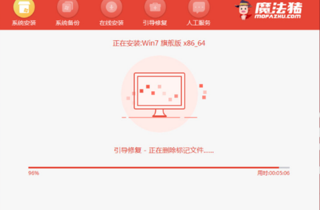 5、然后在pe系统界面,魔法猪装机工具会自动打开并安装win7系统。