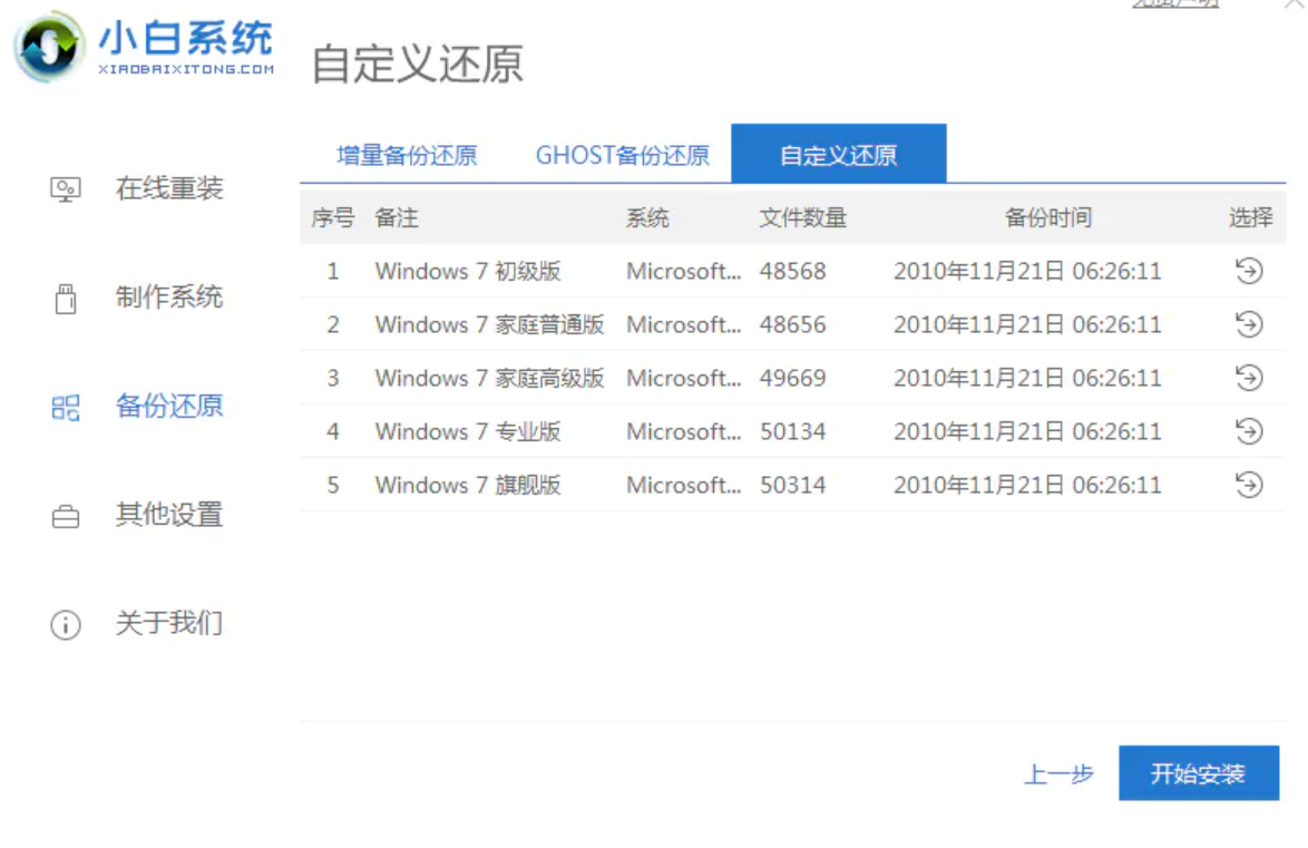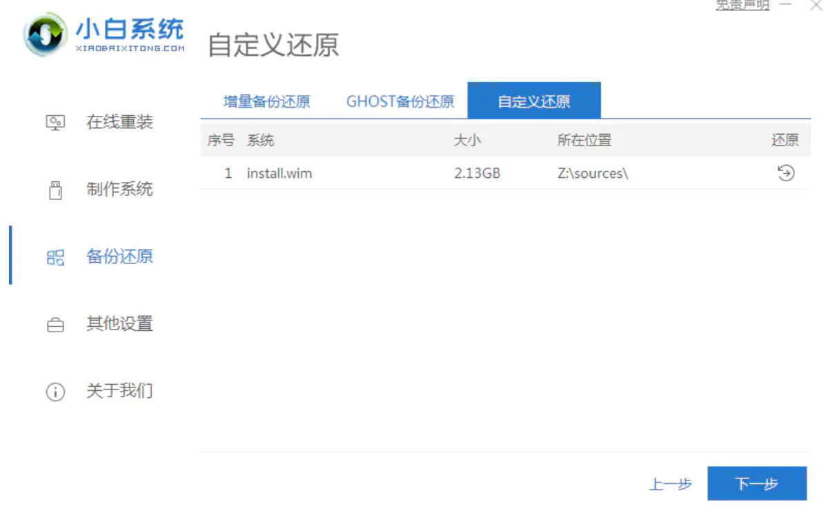 1、下载并打开小白系统软件,点击备份还原——自定义还原,小白会识别出系统文件,识别出来后点击下一步。
